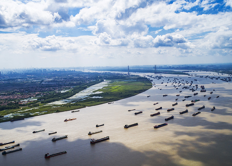 船舶在湖北省武漢市陽(yáng)邏港區(qū)水域行駛(2018年8月13日攝,無人機(jī)照片)。新華社記者 肖藝九 攝