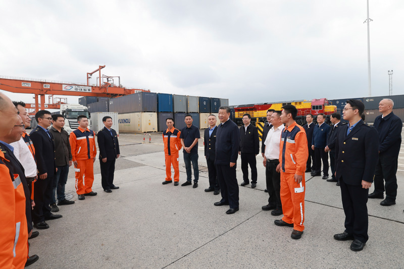 4月22日至24日,中共中央總書記、國家主席、中央軍委主席習近平在重慶考察。這是22日下午,習近平在重慶國際物流樞紐園區重慶鐵路集裝箱中心站,同貨車司機、列車司機、裝卸工人、場站管理人員等親切交流。新華社記者 王曄 攝